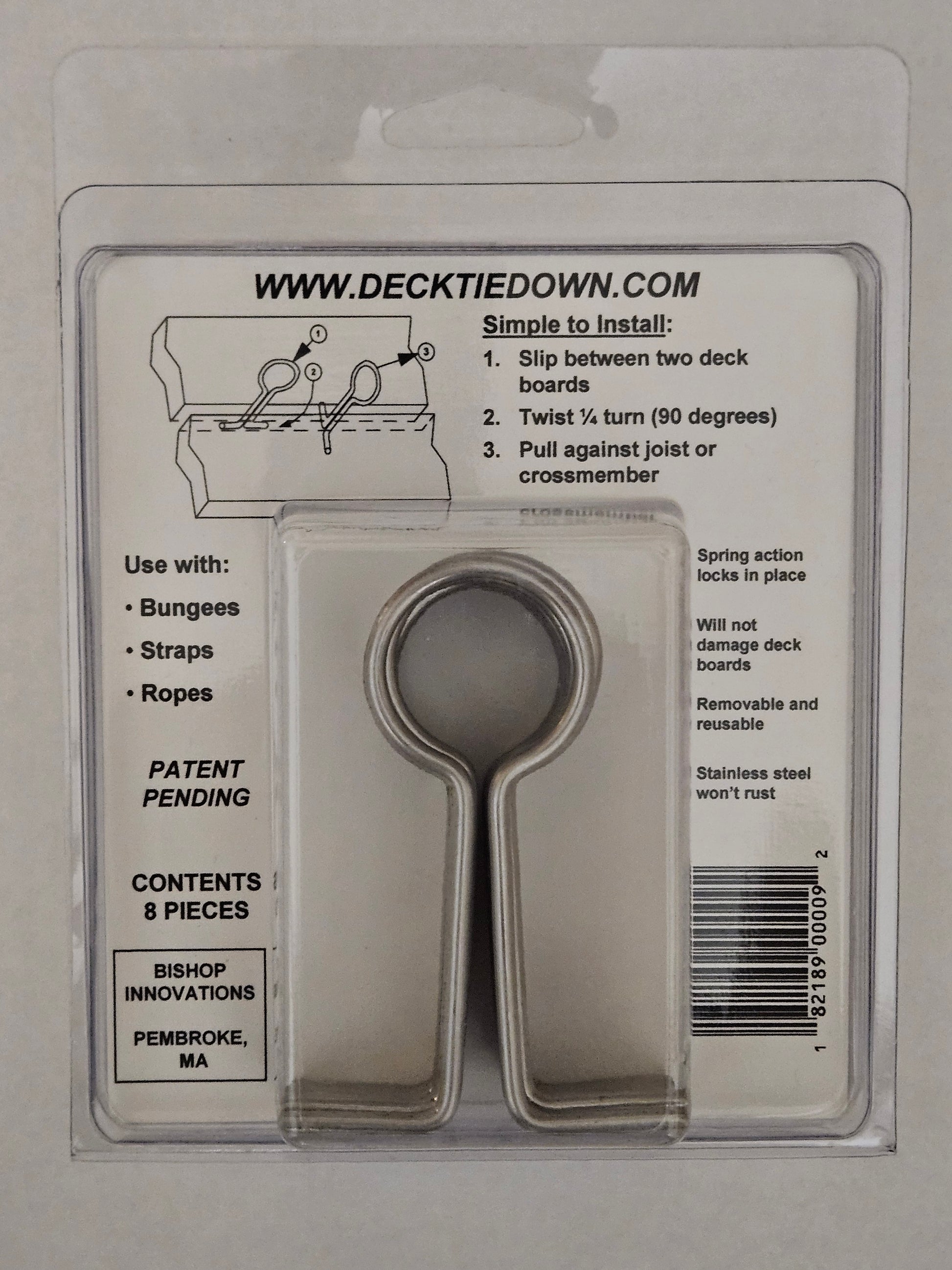 The retail package for Deck-Tiedown clips is a hanging clamshell package that includes 8 of our universal size DT-2 clips. MSRP for single package is $12.49.